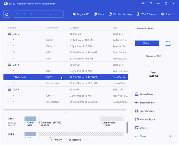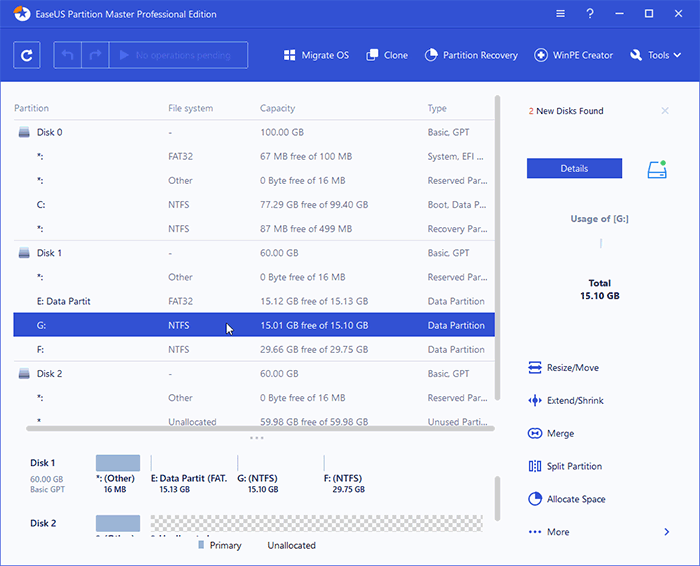 Łatwe dla wszystkich użytkowników! EaseUS Partition Master wykorzystuje inteligentną technologię partycjonowania do obsługi partycjonowania dysku systemu operacyjnego i partycjonowania dysku z danymi. Po wybraniu funkcji zmiany rozmiaru/przesunięcia/powiększenia/zmniejszenia/sformatowania miejsca na dysku proces ten nie nastąpi natychmiast i możesz sprawdzić komunikat ostrzegawczy, aby zdecydować, czy to zrobić. To samo dotyczy innych funkcji. W przypadku zupełnie nowego dysku twardego postępuj bezpośrednio zgodnie z nowym przewodnikiem po dysku, aby łatwo zarządzać dyskami twardymi.
